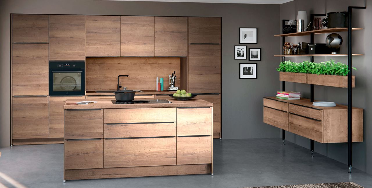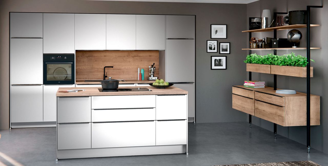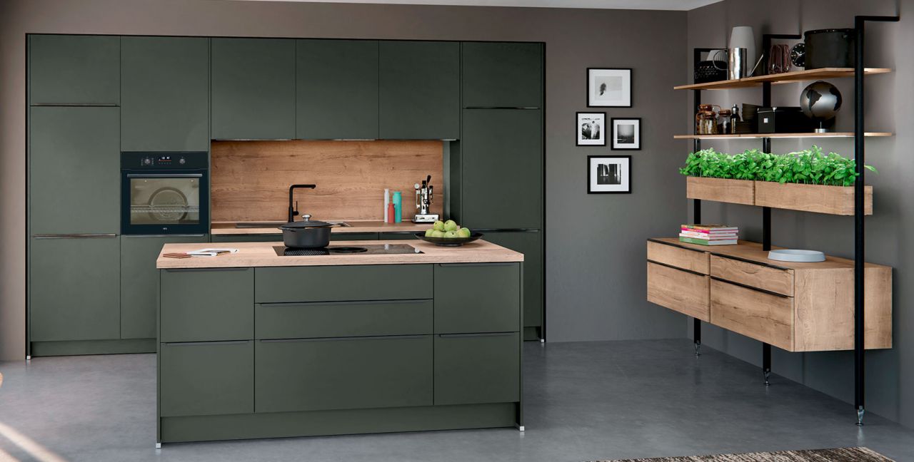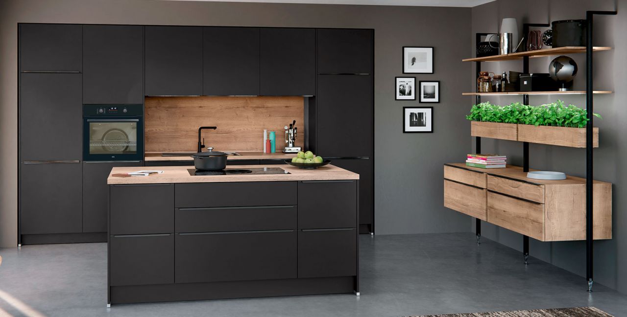 Inklusive Einbaubackofen schwarz AEG NBU5P40SK Energieeffizienzklasse A++, Glaskeramik Kochfeld mit Induktion und Kochfeldabzug (Umluft) Bora GPNextE80N, Kühlschrank mit **** Gefrierfach Progress PK0855 Energieeffizienzklasse E, Einbauspüle Edelstahl Rodi Okio Line 85 Deep, Stollenregalsystem, Unterschränken mit Großraumauszügen.